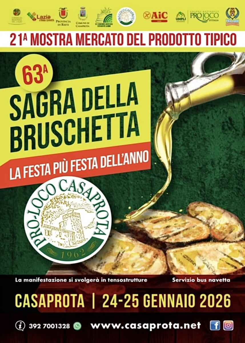 Casaprota si prepara ad accendere l’inverno sabino con uno degli appuntamenti gastronomici più attesi del territorio. Nel fine settimana di sabato 24 e domenica 25 gennaio il borgo in provincia di Rieti tornerà a celebrare uno dei riti più semplici e identitari della cucina contadina: la bruschetta. La storica sagra, arrivata alla 63ª edizione, sarà affiancata dalla 21ª Mostra Mercato del Prodotto Tipico e trasformerà il centro storico in un crocevia di gusto, musica e tradizioni locali.